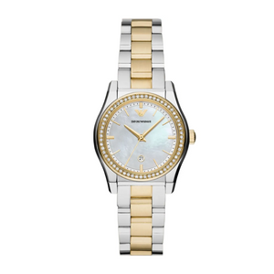 Succombez à cette magnifique Emporio Armani au cadran nacré blanc irisé qui capture délicatement la lumière dans un jeu de reflets subtils. Son bracelet bicolore acier et doré s'harmonise parfaitement avec la lunette sertie de cristaux scintillants pour un glamour sophistiqué. Les index dorés et la fonction date à 6h créent un équilibre parfait entre élégance féminine et praticité moderne.