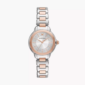 La Emporio Armani AR11643 illumine le poignet avec son design bijou irrésistible. Son cadran argenté présente des segments pavés de cristaux brillants qui créent un effet rayonnant, capturant la lumière à chaque mouvement. La lunette doré rose adoucit le boîtier en acier poli, tandis que le bracelet bicolore argent et doré rose complète l’ensemble avec élégance. Une montre conçue pour les femmes qui veulent allier sophistication, brillance et modernité.