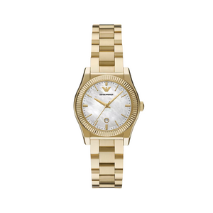 La Emporio Armani AR11657 séduit par son cadran en nacre blanche, offrant des reflets subtils et raffinés. Les index et aiguilles dorés s’harmonisent parfaitement avec le boîtier et le bracelet en acier inoxydable doré, créant un ensemble luxueux et lumineux. Idéale pour sublimer vos tenues, cette montre allie sophistication et style intemporel.
